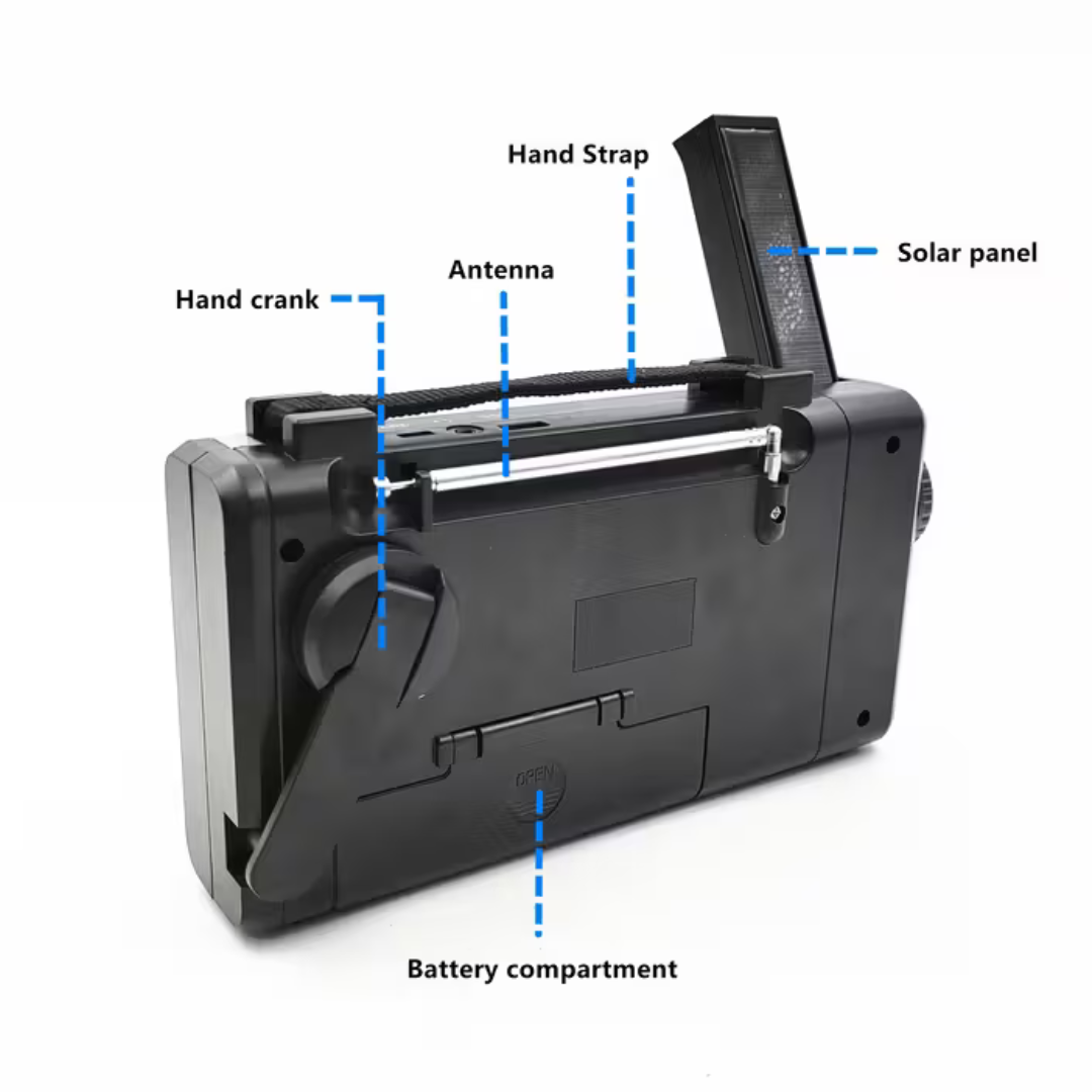 - Handcrank power: altijd energie, zelfs zonder stroom.