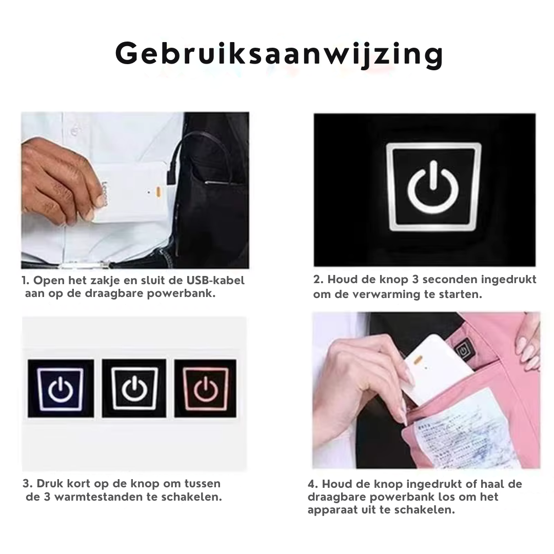 De HeatCore Jacket werkt met elke standaard 5V-USB-powerbank, eenvoudig aan te sluiten via het zakje met USB-poort. Zodra je de powerbank verbindt en de knop drie seconden ingedrukt houdt, begint de jas binnen enkele seconden op te warmen. Dankzij de energiezuinige grafeen-elementen kun je tot wel acht uur genieten van constante warmte, afhankelijk van de capaciteit van de powerbank.