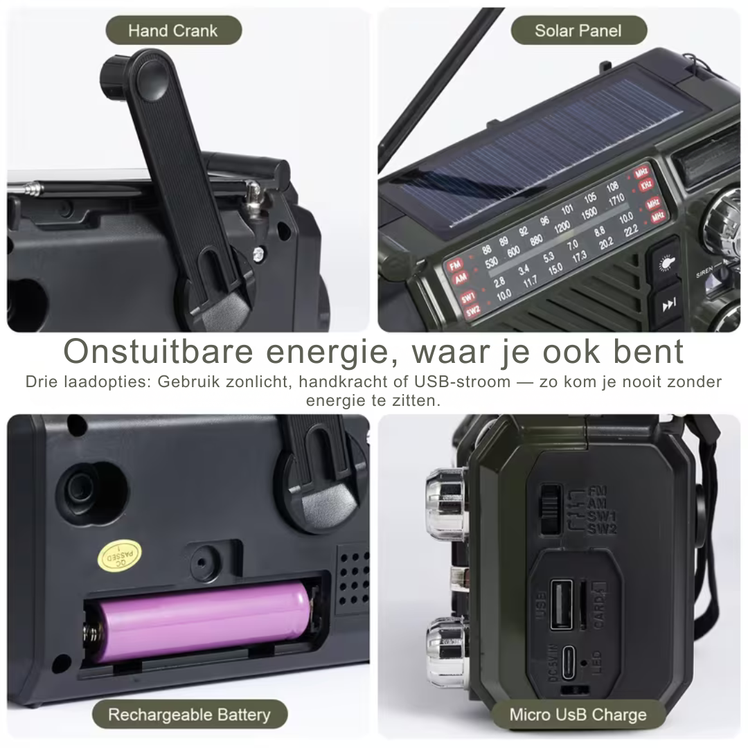 Altijd bereik, zelfs als de stroom uitvalt. Deze multifunctionele noodradio combineert een betrouwbare radio-ontvanger, powerbank, zaklamp en SOS-functie in één compacte gadget. Ideaal voor preppers, kampeerders, reizigers en iedereen die voorbereid wil zijn op noodsituaties.
