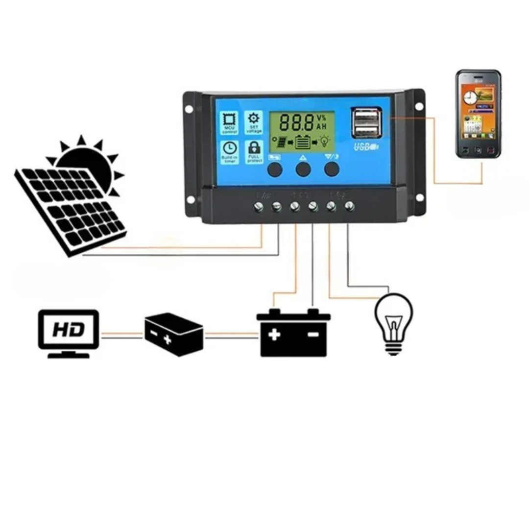 - Controllers, op 10A controller 1 paneel - op 20A controller tot 2 panelen - op 30A controller tot 3 panelen - op 40A controller tot 4 panelen - op 50A controller tot 5 panelen - op 60A controller tot 6 panelen.