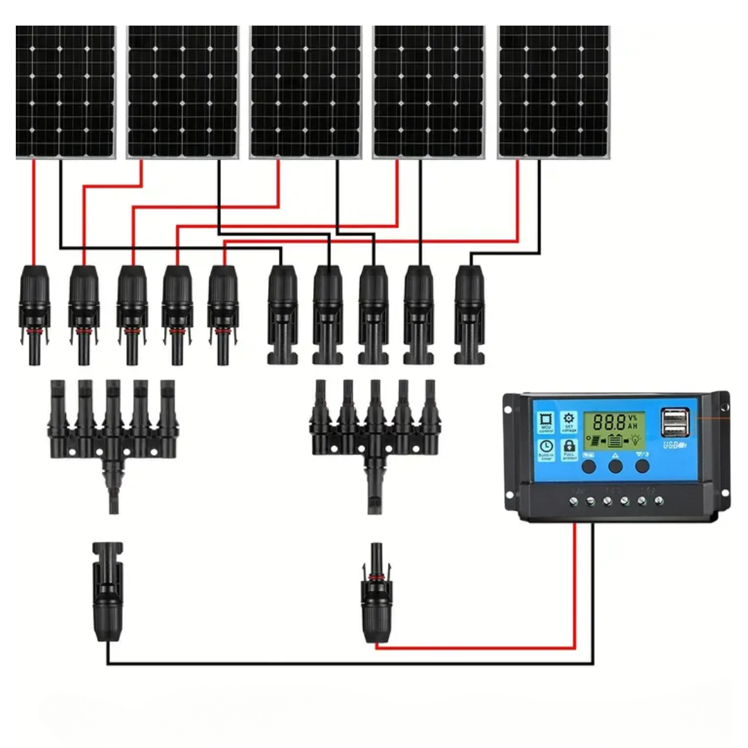 Op de afbeelding een aansluitvoorbeeld van 5 parallel aangesloten panelen