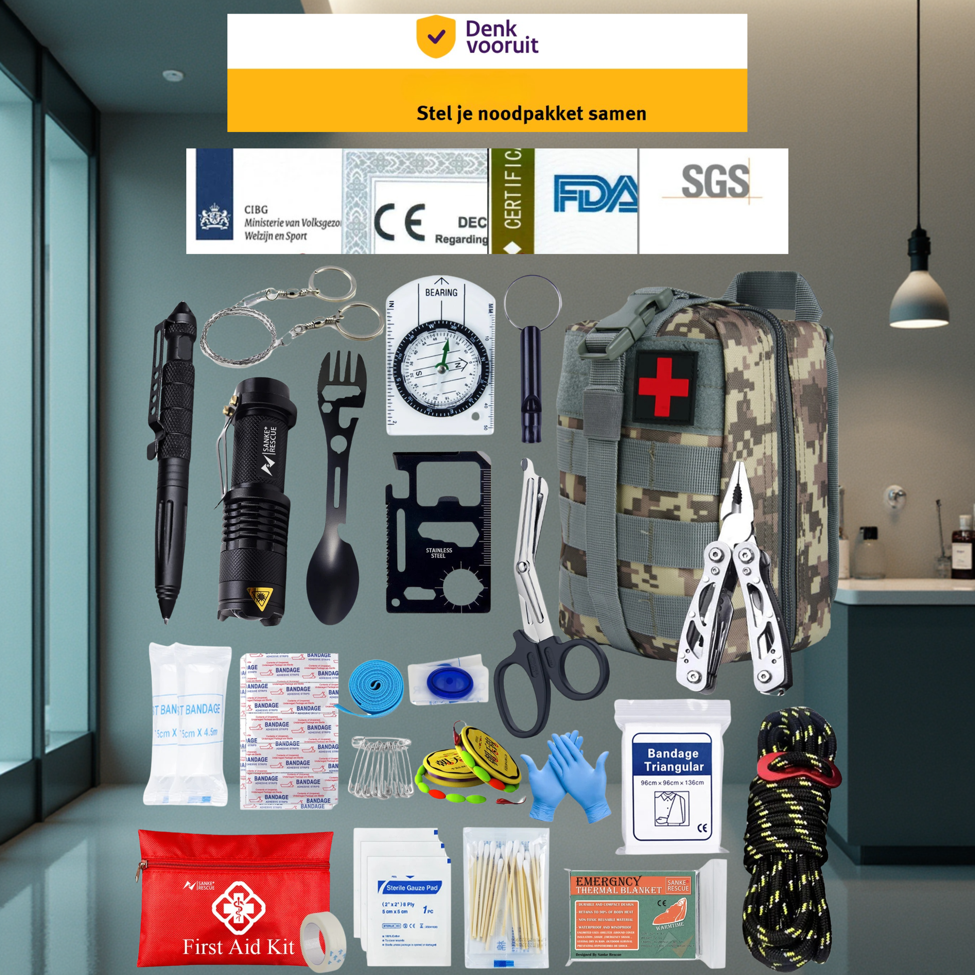 Het RescuePack 24-Deluxe is een uitgebreide en gecertificeerde set met 379 onderdelen, ontworpen om in uiteenlopende situaties praktisch voorbereid te blijven – thuis, onderweg of buiten.