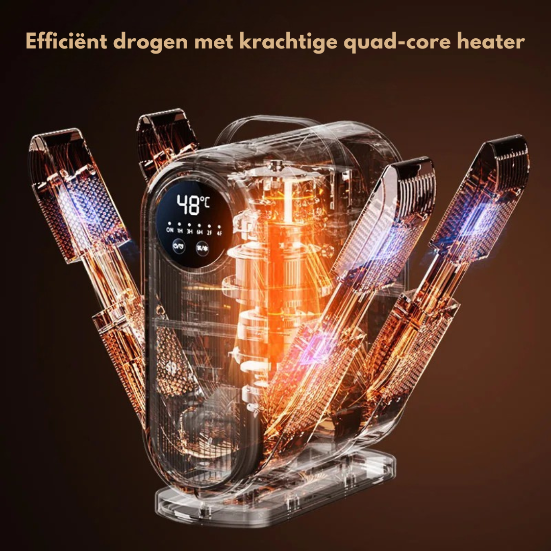 Vier intrekbare droogarmen (standen: 2F/4F) passen in elk type schoen of laars. Compact op te bergen en gemaakt van hoogwaardig ABS. Met 180W droogt hij efficiënt, stil en energiezuinig.