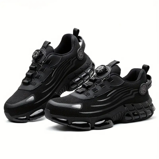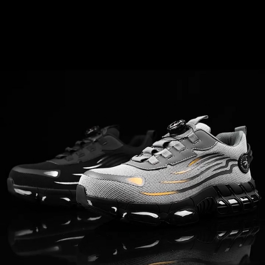 De SteelGuard veiligheidsschoenen combineren een luchtkussen zool, ademend mesh, een stalen neus en een kevlar anti-perforatiezool tussenzool. Resultaat: minder pijn aan voeten, knieën en rug – en droge, frisse voeten tijdens lange werkdagen.