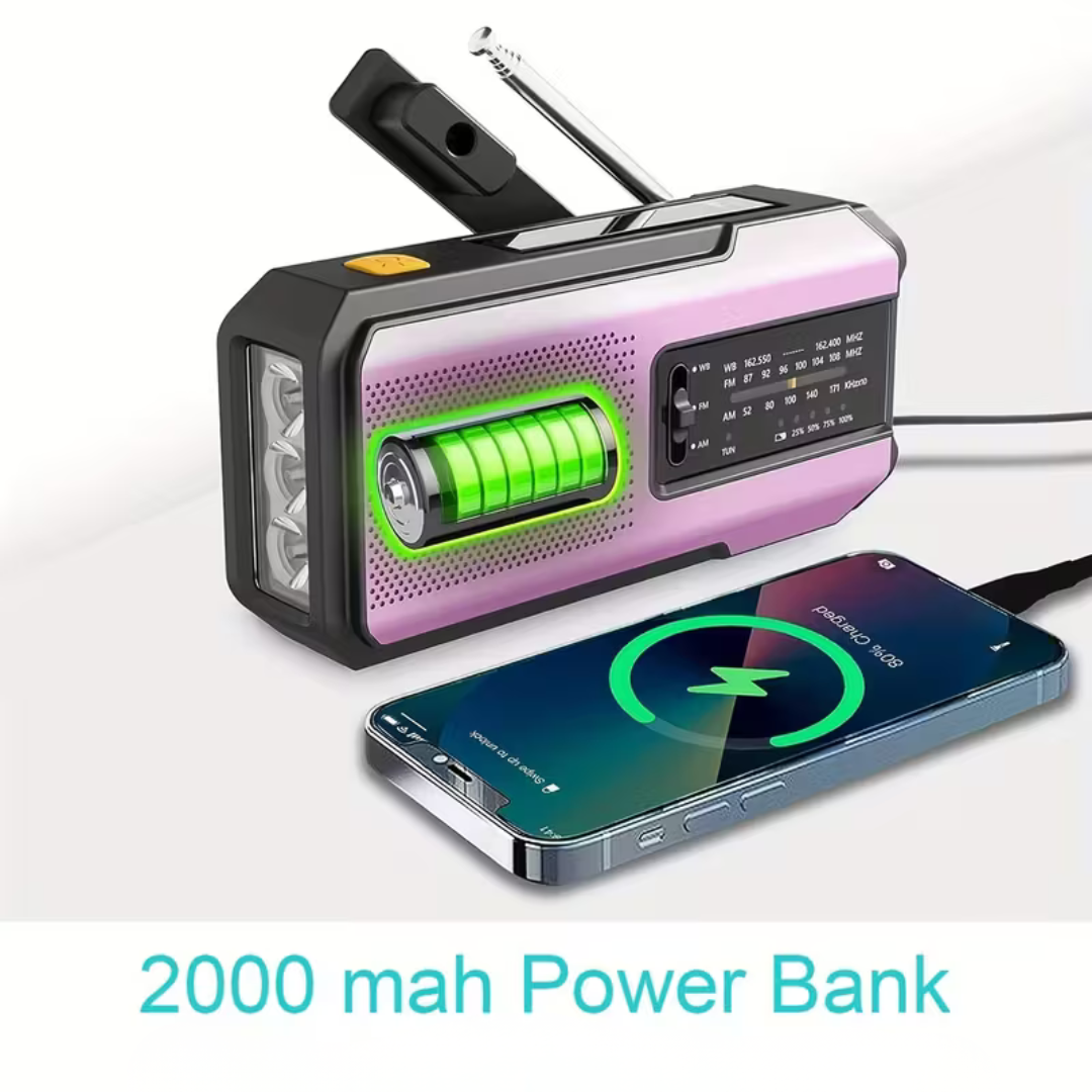 De ingebouwde 2000 mAh lithium-polymeer batterij voorziet de radio en zaklamp van energie en kan ook dienen als nood-powerbank om je smartphone kort bij te laden voor een belangrijk telefoontje of noodbericht.
