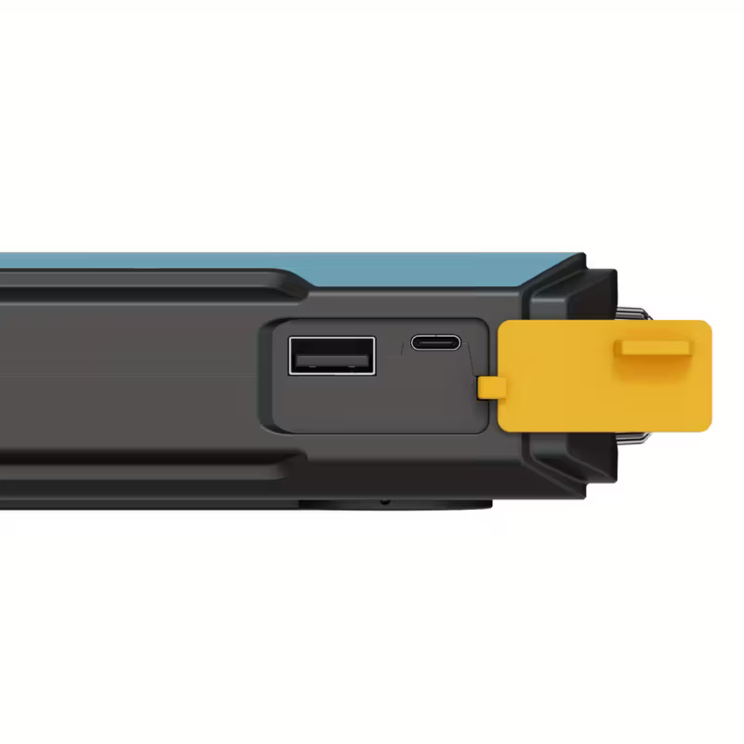 - Drie energiebronnen: zonnepaneel, handcrank en USB-C