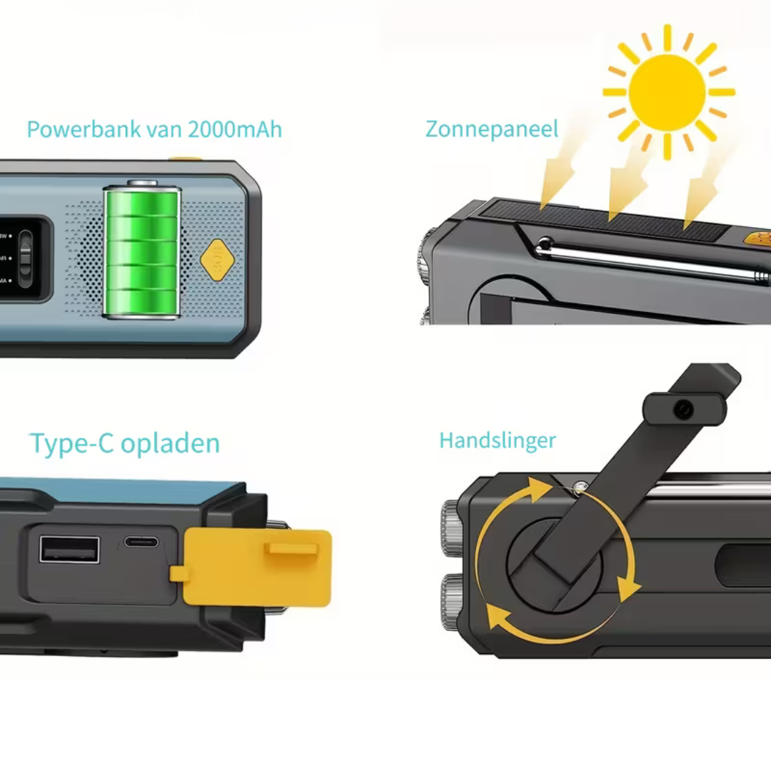 - Handcrank (dynamo) – altijd noodstroom bij de hand